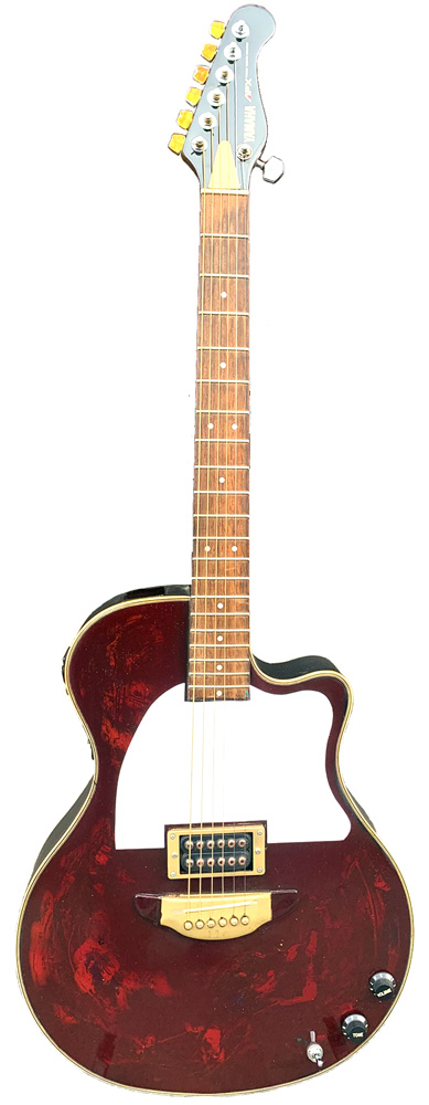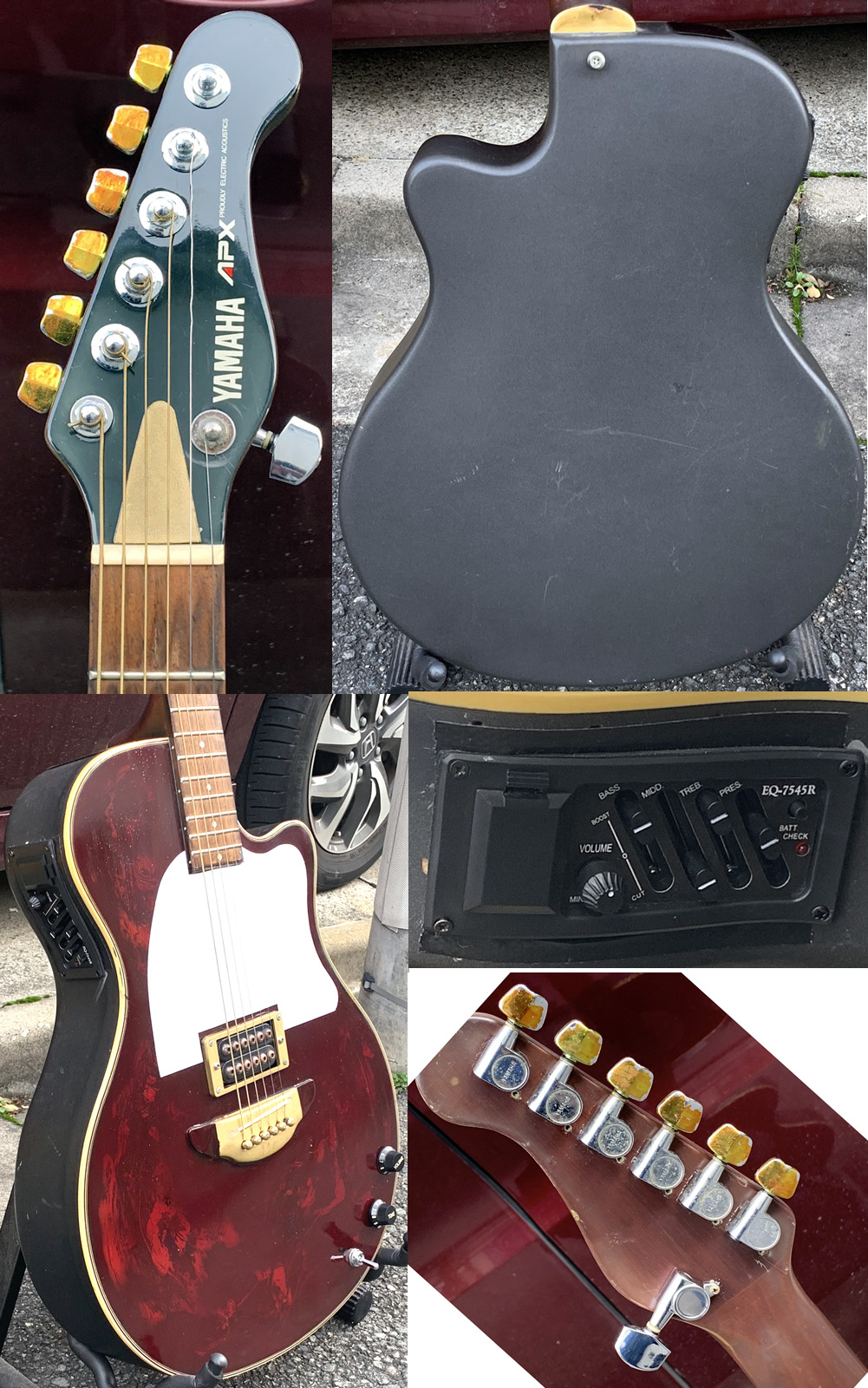 YAMAHAのAPXが前オーナーによってエレキに改造されていたので、ハイブリッドにカスタマイズしました。ハウリング防止にサウンドホールは全面ピックガードで覆い、付けられていたハンバッキングも利用、取り外されていたアコギ用のプリアンプの代わりに別のプリアンプも装着してアコギ・エレキの切り替え使用が出来るようにしました。真っ黒にペンキで塗られていたので、できる限り落としてマルーンカラーに塗装しました。大型ピックガードにしてテレキャスターっぽい外装にしました。シングルヘッドは1弦が長すぎるので、逆サイドにペグを1個足してます。 |