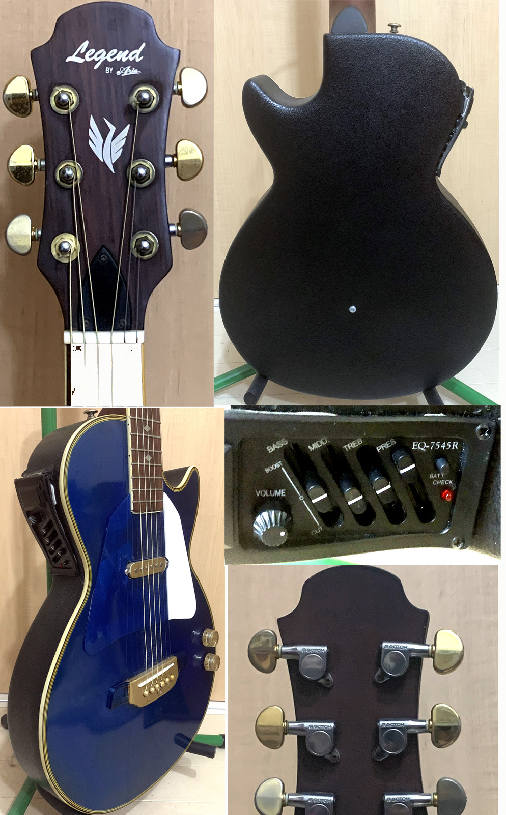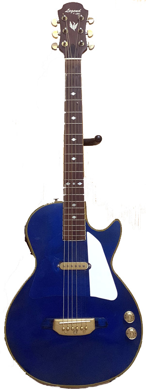 今回はレスポール風のハイブリットにする為、ARIAの小型ラウンドバックをカスタマイズしました。同様にハウリング防止にサウンドホールは全面ピックガードで覆い、センターにピックアップを追加し、別回路出力してアコギ・エレキの切り替え使用が出来るようにしました。全体をBLUE仕様、レスポールのピックガードにして雰囲気を出しました。