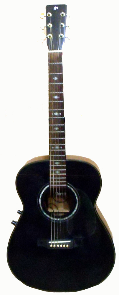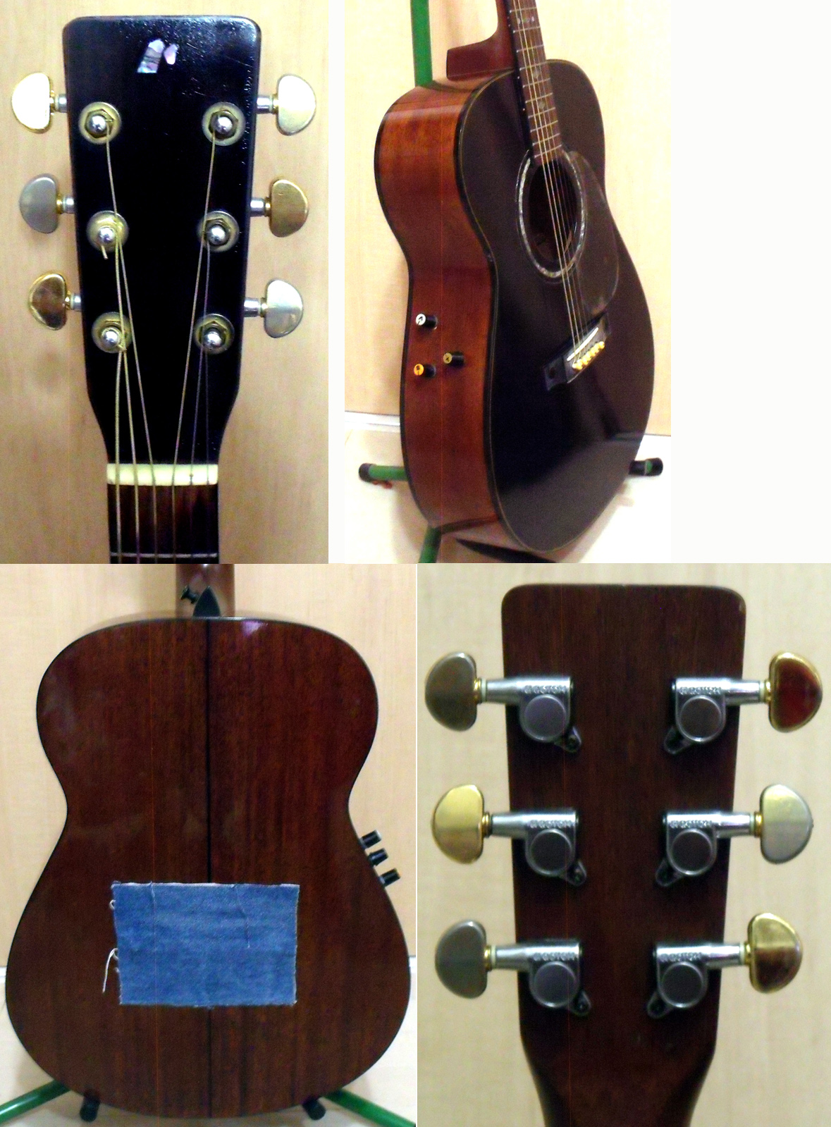 最近気に入ってる000タイプです。このタイプは薄くて小さいので女性に人気があり、MARTINのOMカスタム風にネイビーブルーに塗装して太めのアバロン加工しました。ピックアップシステムをつけて、エレアコにしました。弾きやすくて、さらにエレアコよりボリュームがあって、形状上独特の音色もあり心地良いギターでした。
