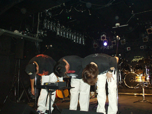 | 結成して4年余。思えばみなさんのおかげで、本当にたくさんのLIVEができました。いろんな場所でたくさんのみなさんにお世話になって、いつも凄く盛り上げてもらって、本当に楽しかったです。今回も、1曲目で弦を切った新庄にすぐに替えのギターを用意して頂いたり。このステージ自体たくさんのみなさんのお力で最高の舞台を用意して頂いて本当にありがたかったです。 |