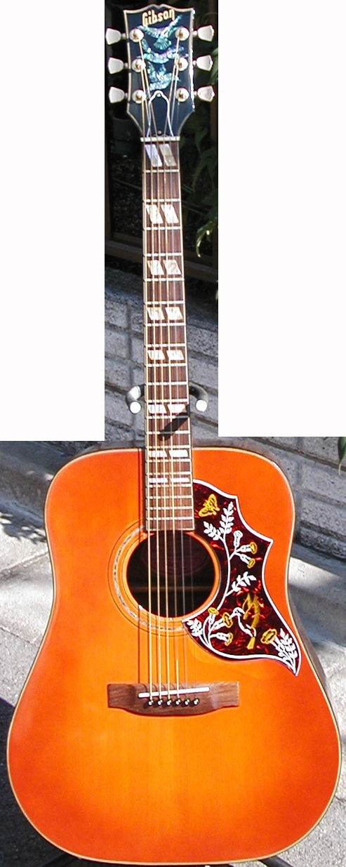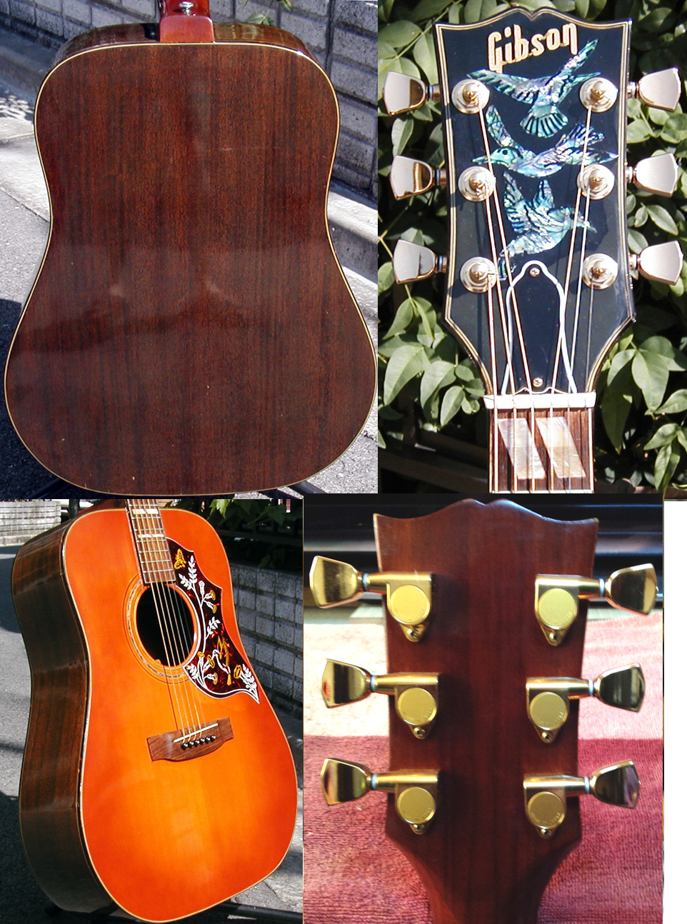 70年代前半、YAMAKIのGIBSONコピーモデルはかなり本物に近いコンセプトで作られています。その中でもこのH-500はハミングバードモデルの最上級でマホガニーのオール単板モデルです。まずホールにメキシコ貝のインレイをいれました。そしてナチュラルだったカラーをHBサンバースト風に塗装。ピックガードはOLDのコピーモデルから豪華な2層のものをチョイス。ヘッドはコアカスタム風に豪華なハチドリをメキシコ貝で。ヘッドロゴも変更。ペグをGOTOのゴールドに替えて完成。豪華でしょ? |