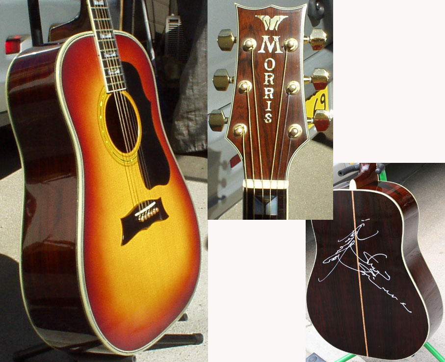 我が家のギターの中で唯一手を加えていないギターです。ブリッジピンをブラスに変えたのと、シャドウのピエゾを装着しただけのカスタマイズです。超希少な100STの角ラベルですから、さすがに怖くて改造できません。余裕が出来ればメーカーに出してトップをもう少し赤くしてもらおうと思ってます。他に手を加えたいギターがたくさんありますから、かなり先になると思いますが。さすがにモーリスが誇るMGシリーズのオールドだけあって、最高に出来の良い美しいギターです。家宝にしたいと思ってます。 |
