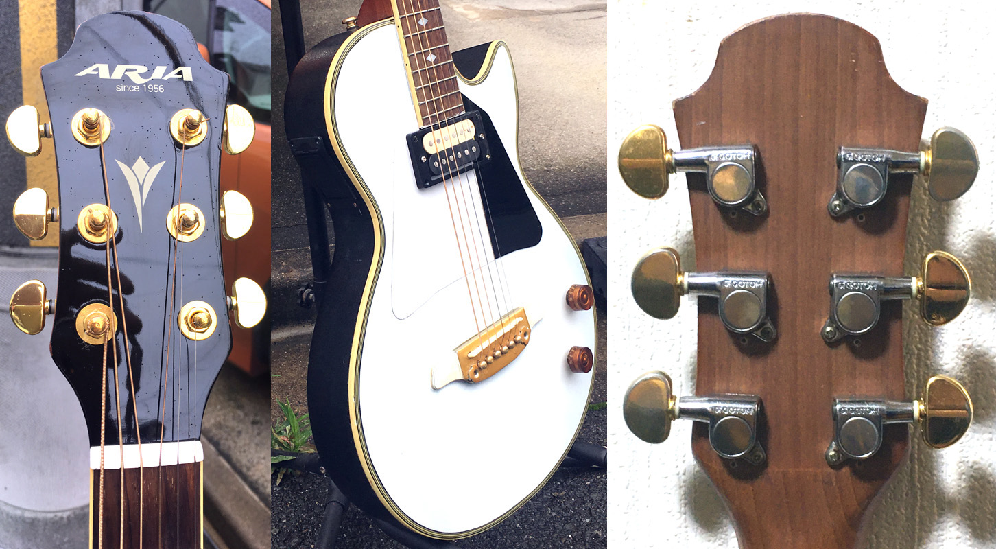 今回はレスポール風のハイブリットにする為、ARIAの小型ラウンドバックをカスタマイズしました。同様にハウリング防止にサウンドホールは全面ピックガードで覆い、センターにピックアップを追加し、別回路出力してアコギ・エレキの切り替え使用が出来るようにしました。全体をWHITE仕様、レスポールのピックガードにして雰囲気を出しました。