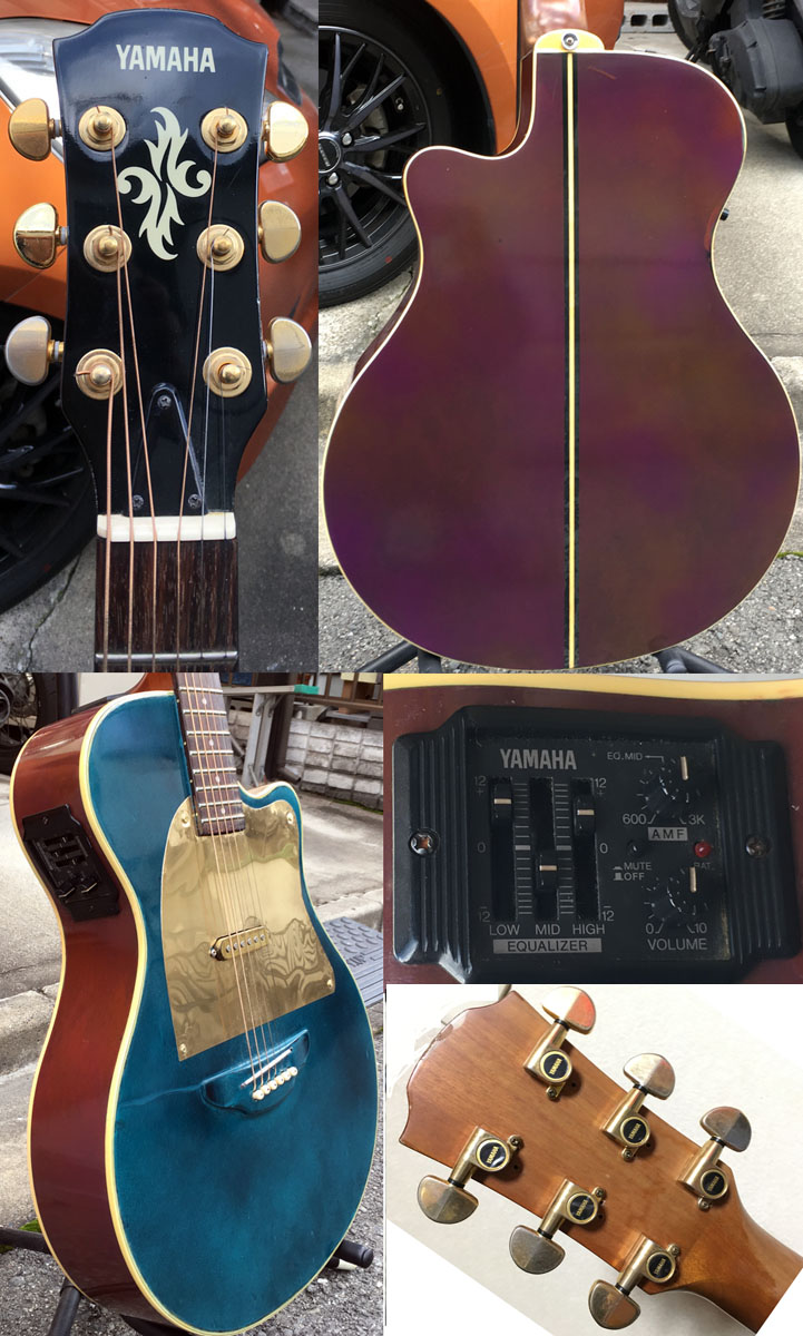 YAMAHAのAPXをバンド使用の為ハイブリッドにカスタマイズしました。ハウリング防止にサウンドホールは全面ピックガードで覆い、センターにシングルコイルのピックアップを追加し、別回路出力してアコギ・エレキの切り替え使用が出来るようにしました。全体をブルーグリーンメタリック、メタルピックガードにしてエレキっぽい外装にしました。