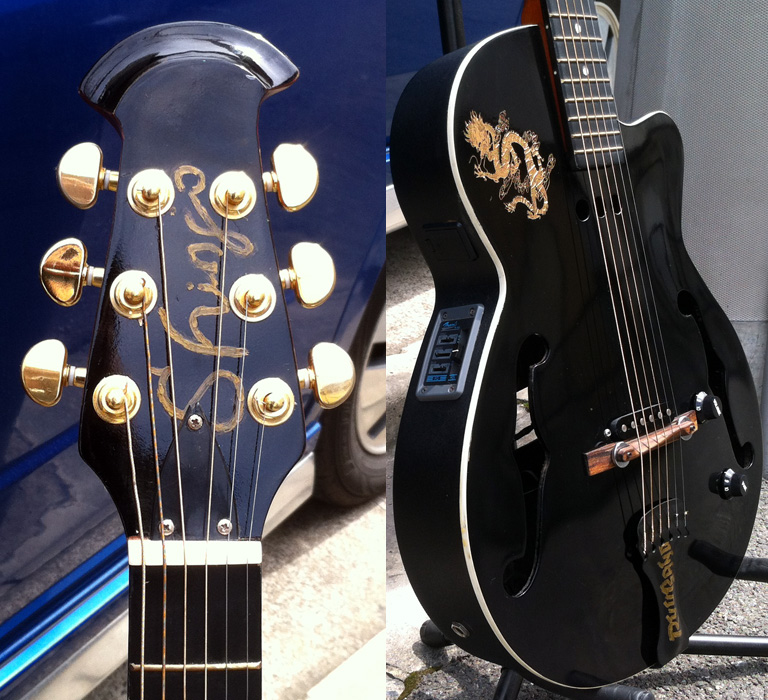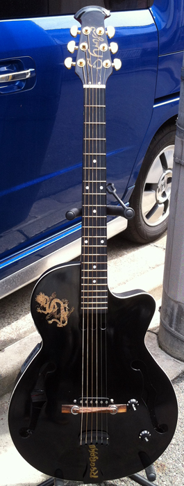 fホールのフルアコを改造してエレアコ+エレキサウンドの2系統出力ハイブリッドギターをつくりました。アコースティック系はピエゾからサイドに装着したアコギ用のプリアンプを通して出力1にアクティブ回路、エレキ系はTOPに装着したシングルコイルからTOP右下のポットを通して出力2に出るパッシブ回路になってます。LINEとエレキアンプに別々に出力し、ボリューム操作で曲中の使い分けを可能にしました。 |