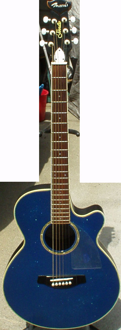 これも状態が悪くピックアップ取り様に入手したトルネードです。遊び心で塗装してみました。車用のブルーメタリックの塗料で塗装してみたのですが、もひとつインパクトが弱かったのでラメの粉を混ぜて吹いてみました。(笑) 超派手になって綺麗だったのでピックガードも透明で作りました。捨てるつもりのギターでしたが、気に入ったので「クリスマス用ギター」の地位を与えました。(笑) |