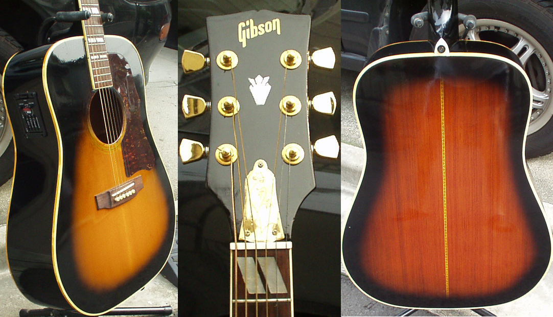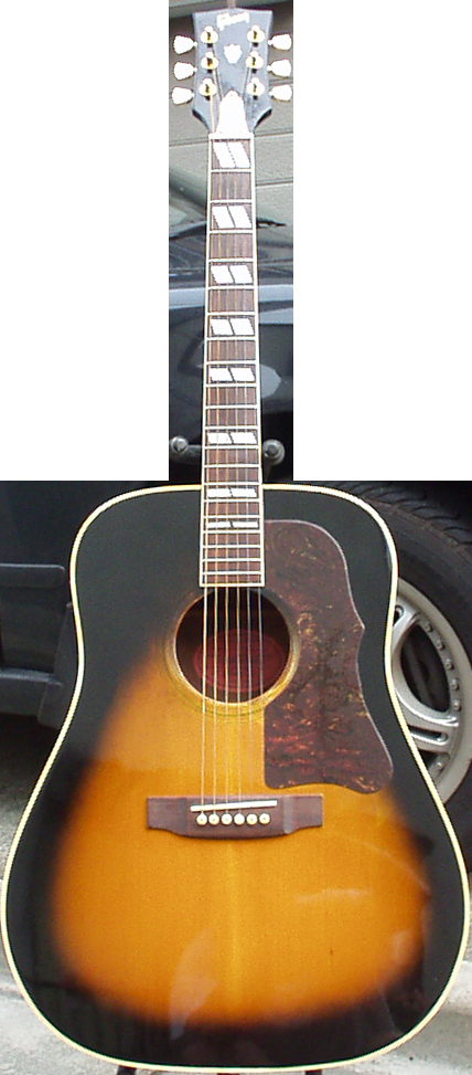 実は別のギターを買う為にNETで見つけた遠方の楽器屋さんに行った時このギターを発見しました。元々DOVEのスタイルで、手に取ってバックを見ると「タモ」っていう見た事のない木で出来ており、いったいどんな音がするのか興味がわきました。いざ弾いてみると、凄い音量で目的だったギターよりも圧倒的にクリアーで歯切れの良いストロークサウンド。当初の予定を変更してこのギターを買ってしまいました。DOVEのピックガードは付いてるけど、全然似てないのでSJ風に改造しました。PEARLとなってますが、林楽器製です。70年代のフォークブーム時には国産でこんなに良い音が溢れていたのかと痛感した逸品です。例によってサイドにプリアンプFISHMAN PREFIXをマウントしました。ヘッドはGIBSONのステッカーになってます。 |