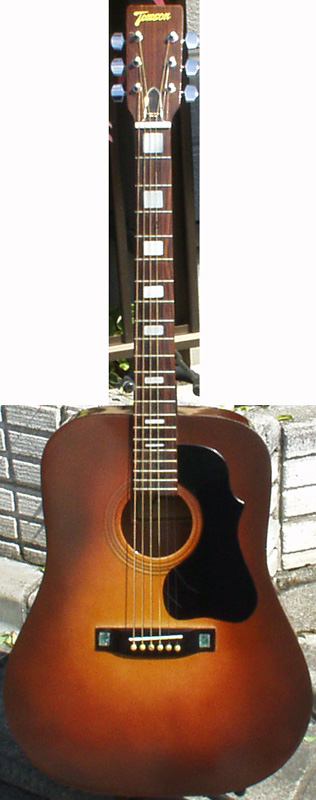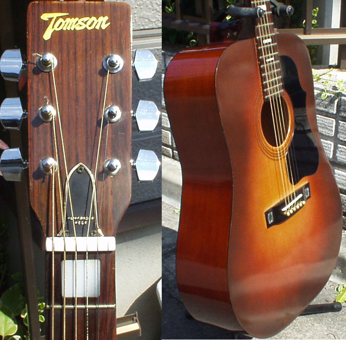 珍しいトムソンのエレアコを入手しました。D−18のようなスタイルにV・T一体型のつまみが付いてましたが、取り外して穴埋めしてサンバースト風に塗装しました。RST−SONICをつけて販売用です。