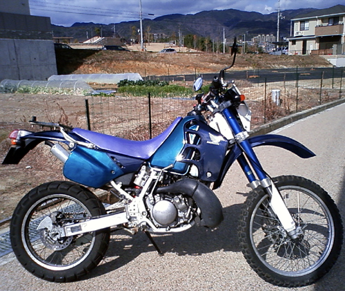 オーバーナナハンにも乗りました。ビッグスク-ターにも乗りました。750ccのオフ車にも乗りました。いろいろ乗った結果、通勤・ツーリング・かっ飛び等、すべてのニーズに応えてくれる一台を選ぶとこれになります。(笑) 2スト250ccのオフ車。軽くて出足が早く、高速でもビュンビュン走れて、渋滞でもすり抜け出来て、荷物も満載できるし、ポジションが楽で視界も良い。こんな万能な単車はないでしょう。91年式と20歳近いご老体ですが、すこぶる快調に走ってくれます。最高に気持ちの良い単車です。 |