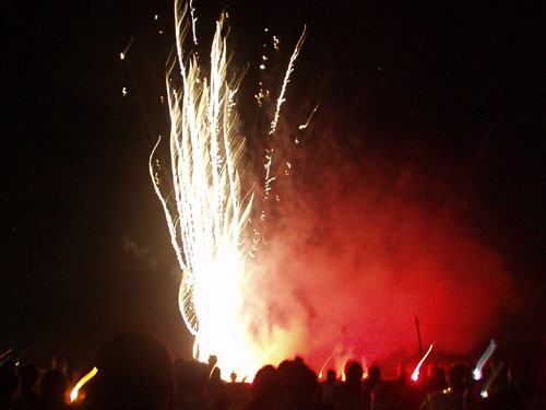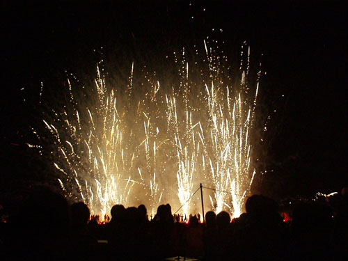 うわさはどんどん広がり年々凄い観衆になり、セッティングするボランティアの数も増え、2万発が5万発、10万発、20万発とロケット花火の数も恐ろしい数になりました。 |