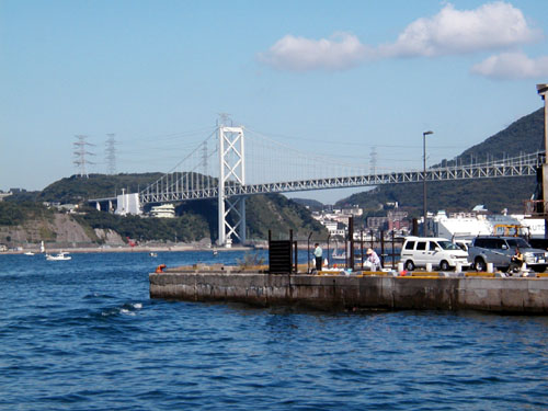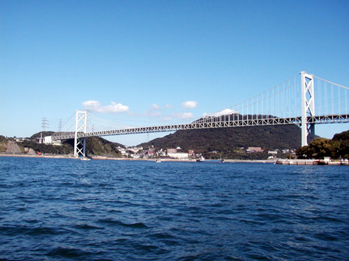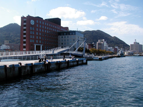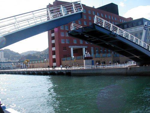 観光船が出入りするたびに上下するはね橋。「ブルーウイングもじ」って言うそうです。 |