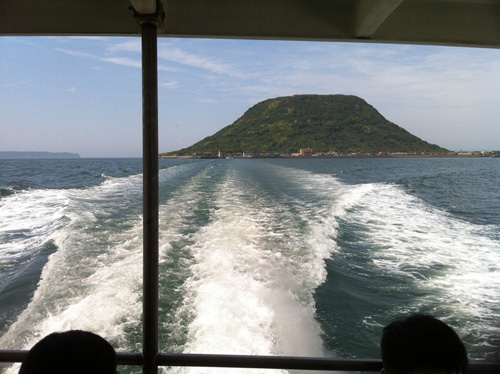 2013年5月5日 唐津城から定期船に乗って高島という島に渡ります。今日は時間が合わなかったのでチャーター船で・・・。この小さな島には宝くじ神社があります。一等祈願に。