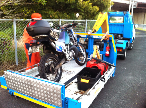 2013年5月5日 高速を3Km程単車を押して東背振ICで降りました。ETCレーンを押してダッシュしました。(笑)GWでJAFも大忙しらしく、待つこと2時間、ようやく救援に来てくれました。勿論、小倉から乗るはずだったフェリーはもう大阪へ向けて出航してしまいました。 |