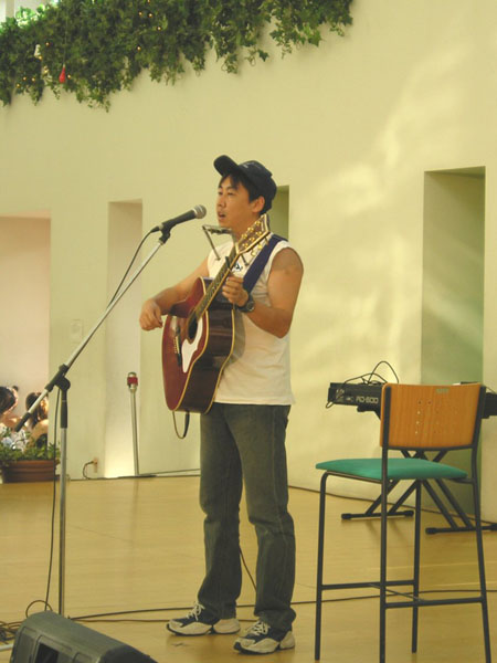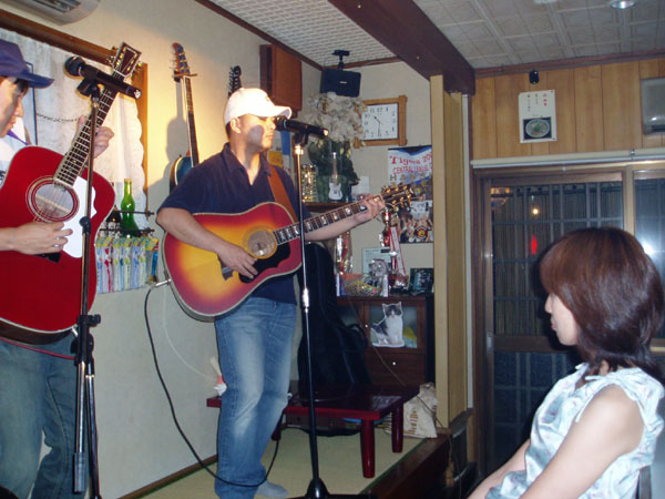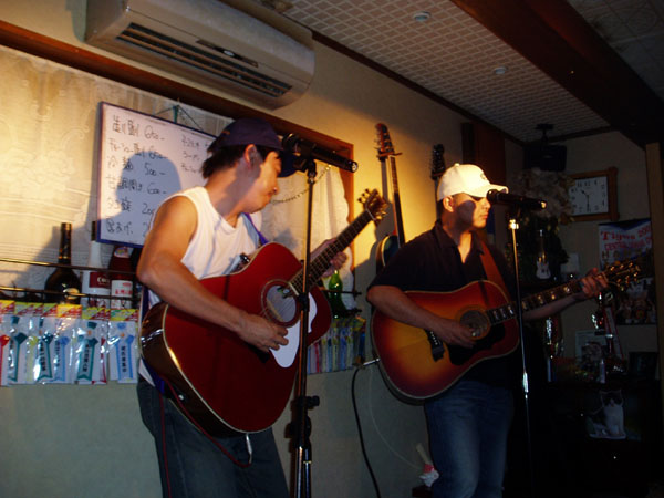 YAMAHA FG-300DE。部品だけで入手したオーベーションのピックアップユニットを強引に取り付けてます。さすがギターは安物でもオベーションの技術でいい音になってます。ギター自体は老朽化がひどくて、このLIVEを最後に引退することになります。ストリート用として大活躍したギターでしたが、最後にこの大舞台で有終の美を飾ってくれました。 |