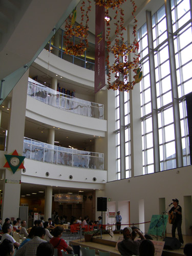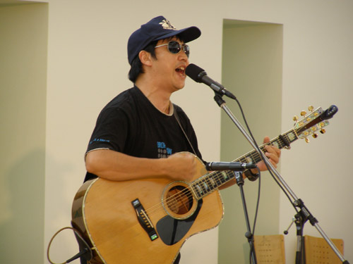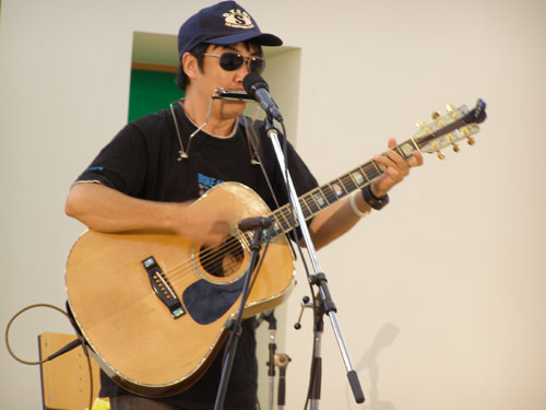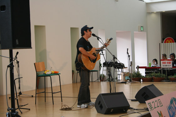 | 2曲目は「愛という名のもとに」。ショッピングセンターの雑踏の中でバラードを歌うのは勇気が要ります。しかしこの曲は後半激しいコードストロークなのでL−15の爆音が光ります。 |